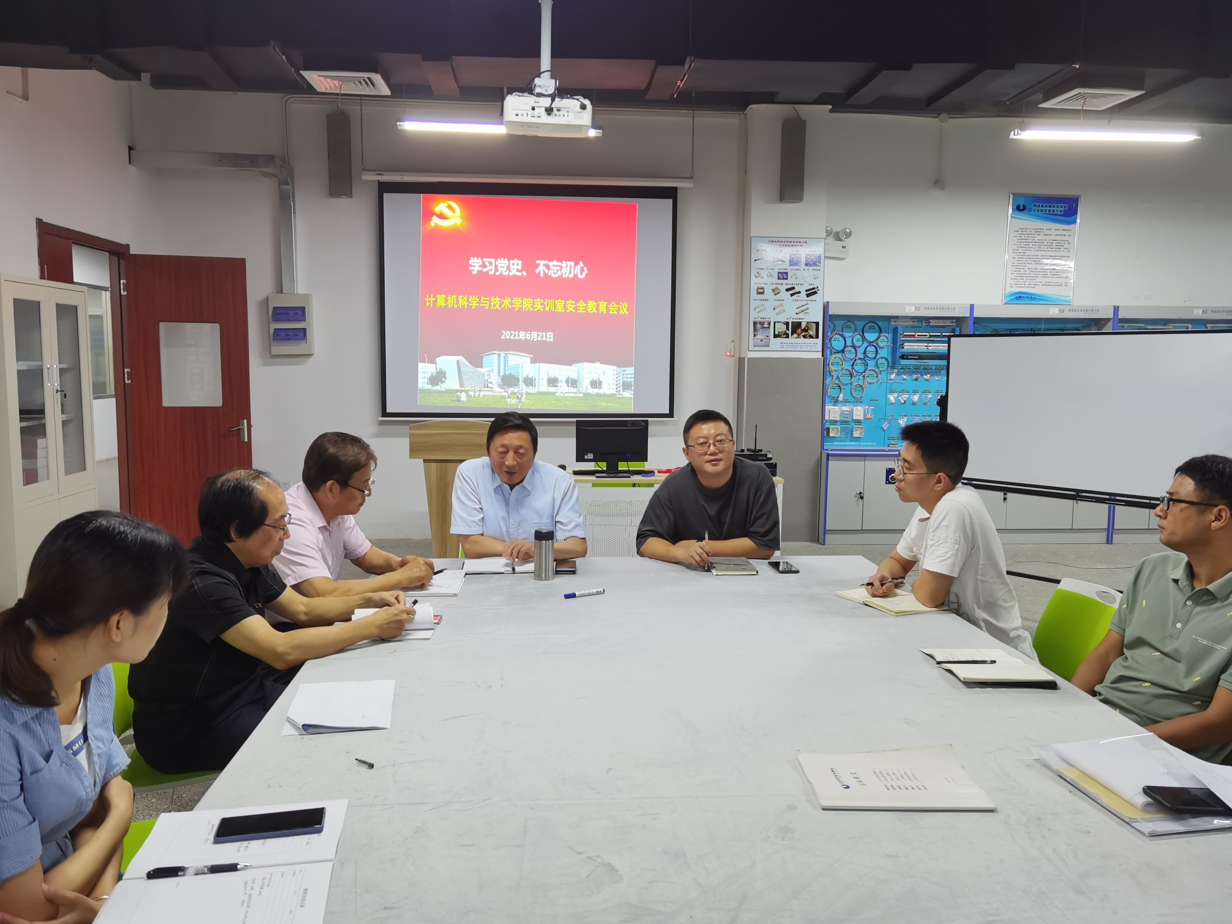 会上,薛胜军院长首先带领各位教师学习了中国共产党近代史,要求各位教师对我党的历史要牢记于心,不忘初心,牢记使命,以对党、对学校、对学生高度负责的态度来进行实训室日常管理工作。其次对实训室安全管理工作提出了明确要求:每一位教职工要高度重视实训室安全工作。在平时维管的过程中,要对照各项安全规定仔细检查,严格落实。对实训室用电安全、布线规范、消防物资配备、物品摆放、环境卫生、台账记录等方面进行全面关注,重点对安全隐患问题及时记录并上报维修整改。
