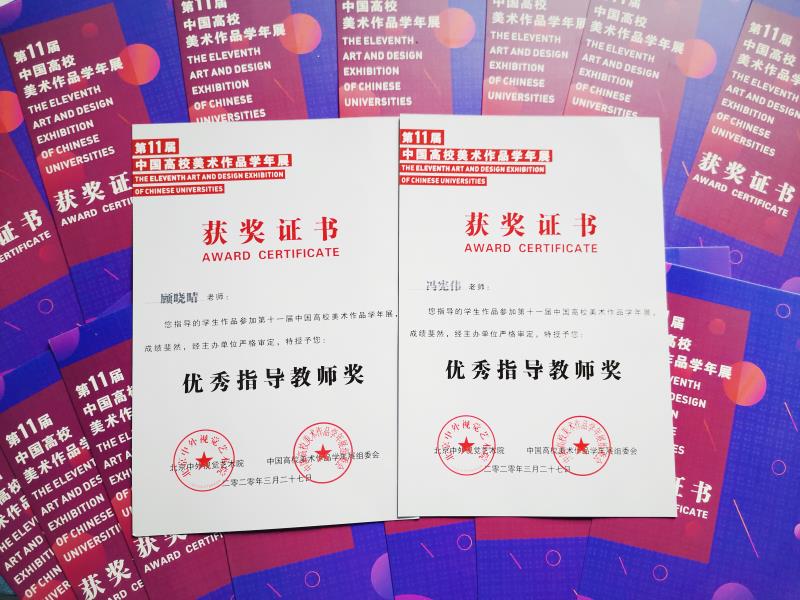 在文化创意学院的组织下,获得多项奖项,顾晓晴老师、冯宪伟老师荣获优秀指导教师奖。其中,冯宪伟老师的作品荣获教师组二等奖;指导的庄武迪、周凡、柳宇、陈梦圆、丁文静等获得优秀作品和入选作品,上述师生的出色表现,为硅湖职业技术学院夺得团体三等奖。