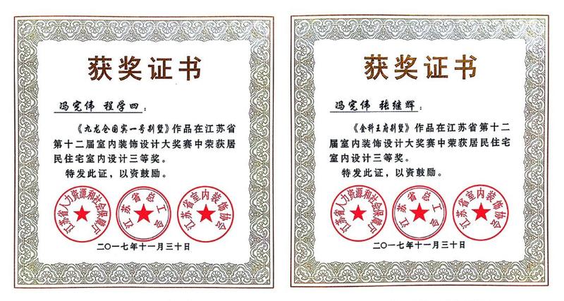 由江苏省人力资源和社会保障厅、江苏省总工会、江苏省室内装饰协会联合主办的“江苏省第十二届室内装饰设计大赛”传来捷报,环艺室内专业冯宪伟、程学四、张继辉老师共同指导的吴颖、刘自立同学作品《瓷文化主题概念室内空间》获得二等奖,共同指导的张玉镜、王腾腾同学作品《湖畔阳光苑》获得三等奖;冯宪伟、程学四老师共同作品《九龙仓国宾一号别墅》获得专业组三等奖,冯宪伟、张继辉老师共同作品《金科王府别墅》等两件作品获得专业组三等奖。